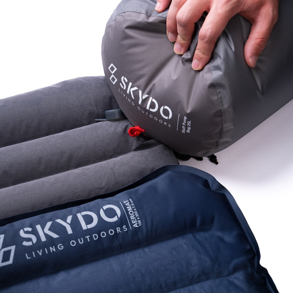 ✓ 1 x Stuff Pump Bag, mit dem du Deine AEROMAT leise von Hand aufpumpen kannst und der gleichzeitig als zweiteiliger Pack Sack zum Verstauen von Isomatte und weiterem Equipment dienen kann.